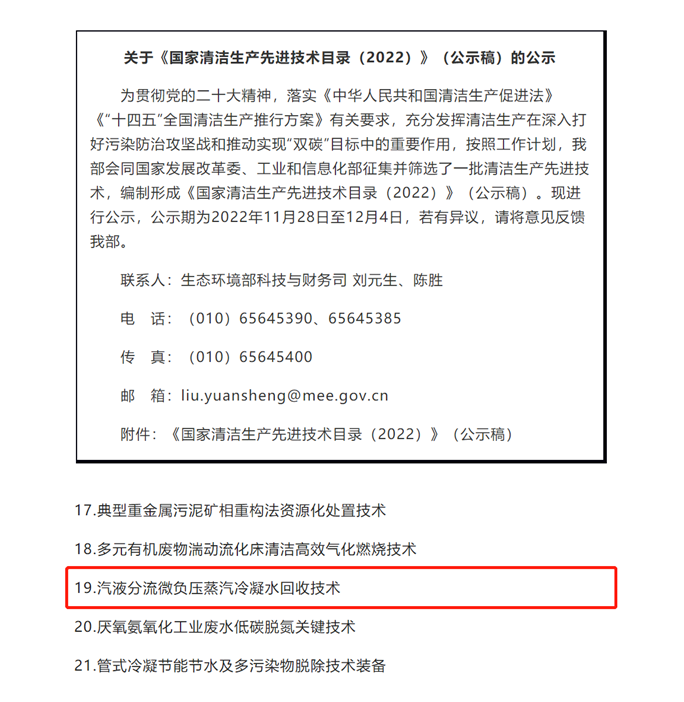 喜報(bào)| 我司汽液分流微負(fù)壓蒸汽冷凝水回收技術(shù)成功入選《國(guó)家清潔生產(chǎn)先進(jìn)技術(shù)目錄(2022)》