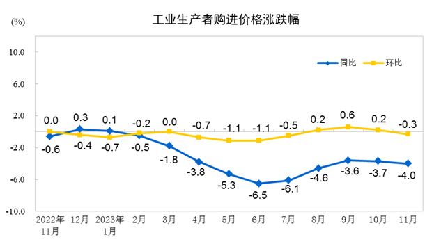 2023年11月份,全國(guó)工業(yè)生產(chǎn)者出廠價(jià)格同比下降3.0%,環(huán)比下降0.3%;工業(yè)生產(chǎn)者購(gòu)進(jìn)價(jià)格同比下降4.0%,環(huán)比下降0.3%。1—11月平均,工業(yè)生產(chǎn)者出廠價(jià)格比上年同期下降3.1%,工業(yè)生產(chǎn)者購(gòu)進(jìn)價(jià)格下降3.6%。