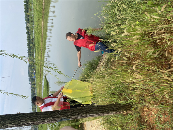 志愿者深入雜草叢中清理河岸垃圾、
