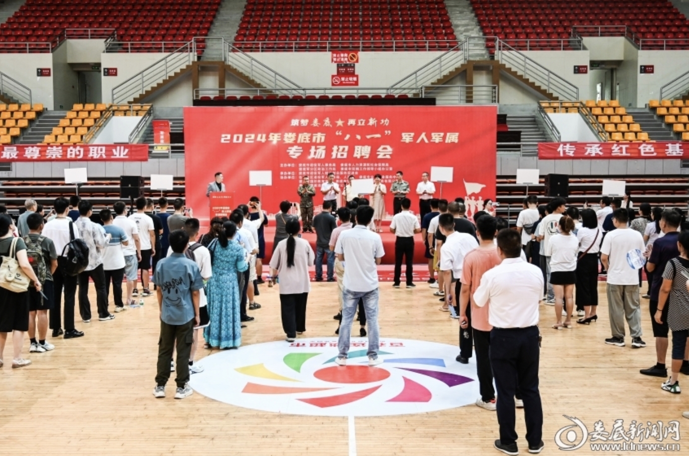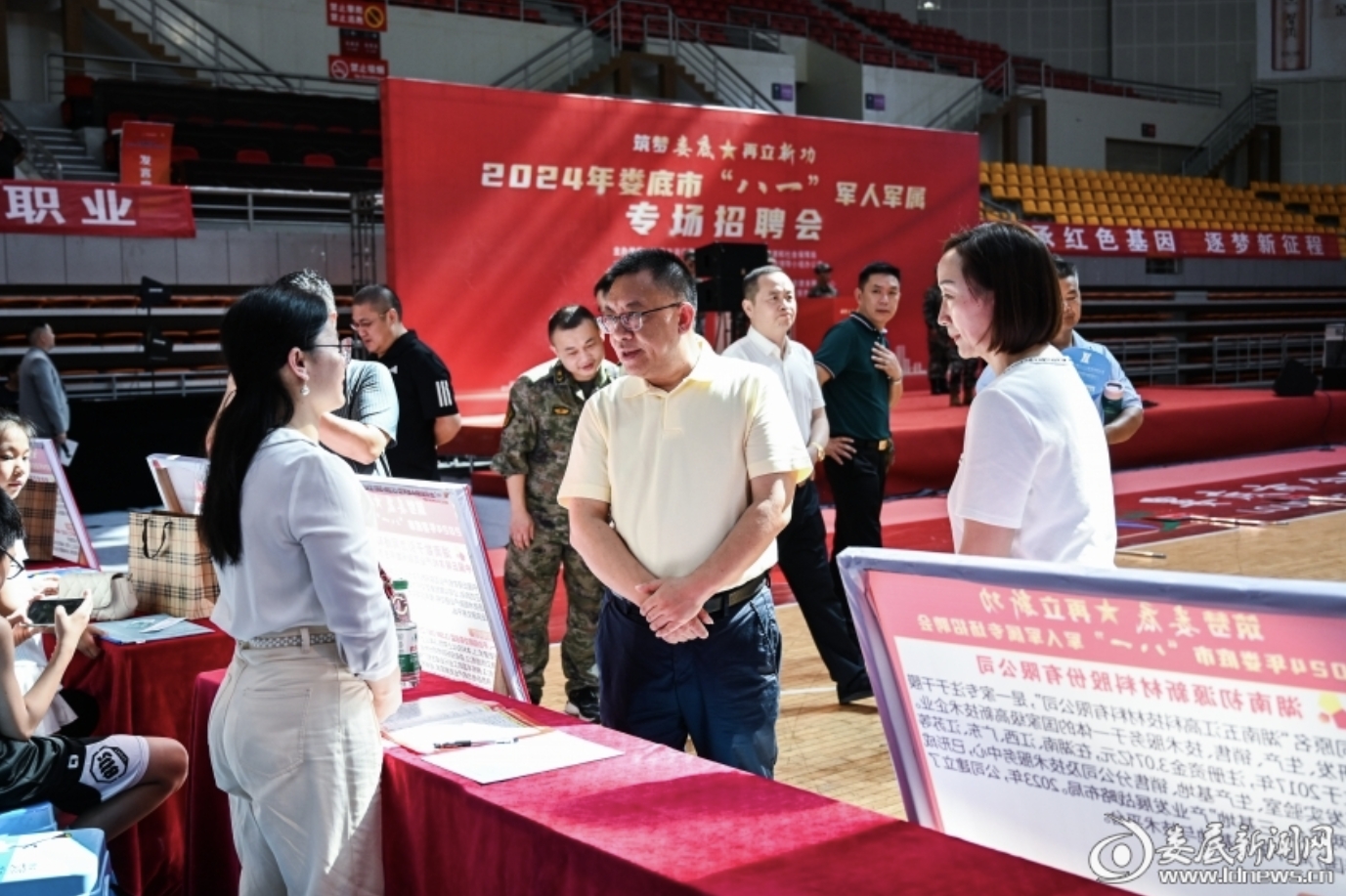 (8月2日,婁底市“八一”軍人軍屬專場(chǎng)招聘會(huì)在婁底市體育中心體育館舉行)