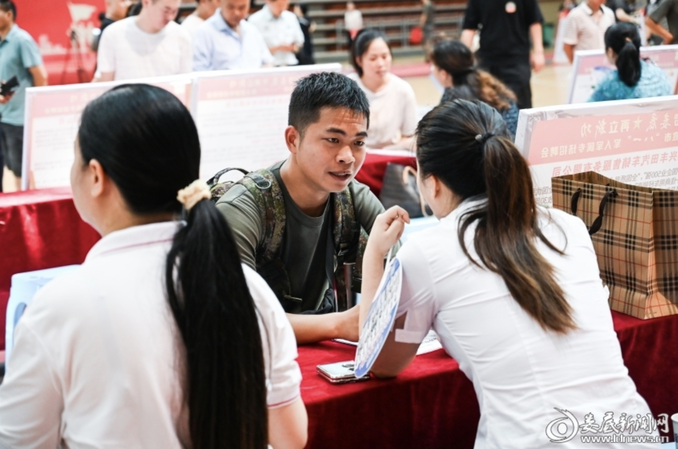 (退役軍人在招聘現(xiàn)場(chǎng)向企業(yè)咨詢工作崗位)